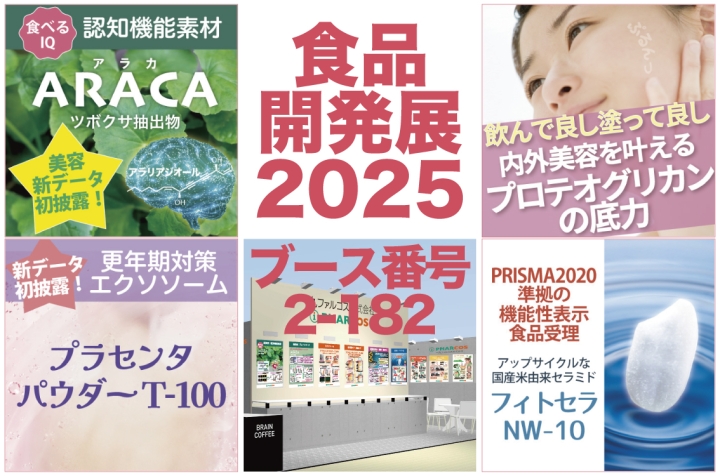 昨年発売した食品向け脳機能改善素材「ARACA(別名ゴツコラ、CICA)」に関する追加データや美容に関する新データを紹介いたします。また、一丸ブース内ではARACA入りコーヒーを提供させて頂きます、会場内で疲れた足にホッと一休み頂けたら幸いです。さらに、豚プラセンタ由来エクソソームの新データもご紹介します!